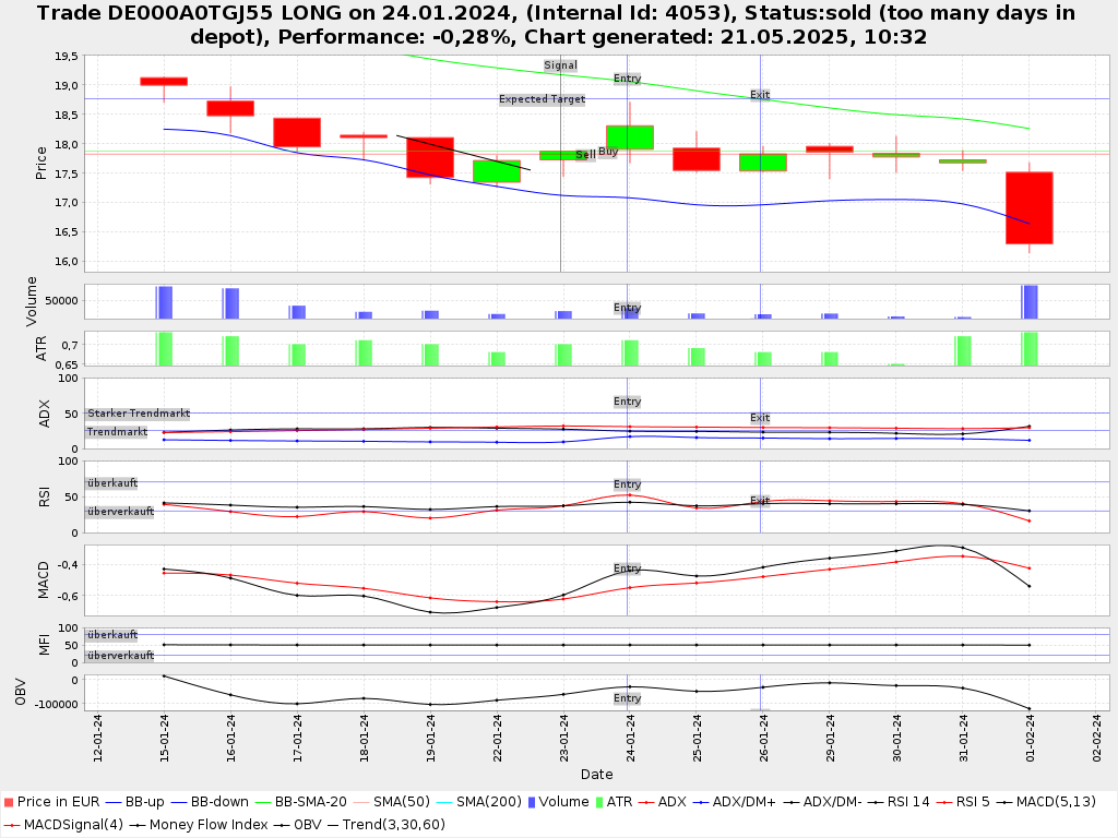 | Automatisch generierte technische Analyse: | +10 Der RSI(5) hat die Grenze von überverkauft (>30) am 22.01.2024 nach oben hin überschritten. Betrachtungszeitraum: 5 Tage vor Kauf. +10 Der Abstand des Kurses am Tag des Signals zum unteren Bollinger Band ist kleiner 5%. (Wert: 4.0%) +10 Der ADX(14) ist größer 25 (31.6574). (Der ADX (Average Directional Index) misst die Stärke eines Trends, während die +DI (Positive Directional Indicator) und -DI (Negative Directional Indicator) die Richtung anzeigen; ein hoher ADX-Wert zusammen mit +DI über -DI signalisiert einen starken Aufwärtstrend, während ein hoher ADX-Wert mit -DI über +DI auf einen starken Abwärtstrend hindeutet. Über 25 bedeutet Trendmarkt, über 50 starkes Signal.) - ADX(14): Zusätzlich liegt der Richtungsindikator +DI (=Directional Indicator) unter -DI, grundsätzlich ein bärisches Signal (Die beiden Linien +DI und -DI im ADX (Average Directional Index) messen die Stärke der Kauf- bzw. Verkaufskräfte: +DI zeigt die Stärke der Aufwärtsbewegung, während -DI die Stärke der Abwärtsbewegung darstellt.) +10 Der Kurs ist drei Tage lang vor dem Signal um insgesamt 5.0% gefallen (>3.0%) +10 Vor dem Signal waren 2 von 3 rote Kerzen (Kurse am Ende des Tages waren niedriger als zu Beginn). Das Ergebnis der technischen Analyse wird auf 0-100 skaliert. |