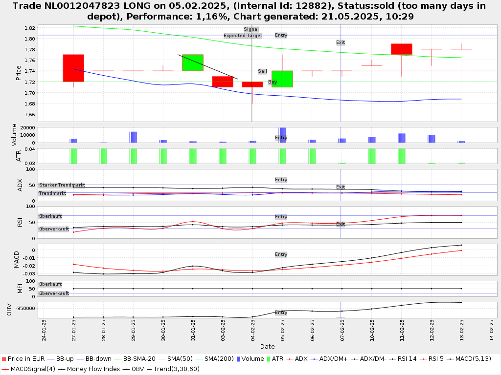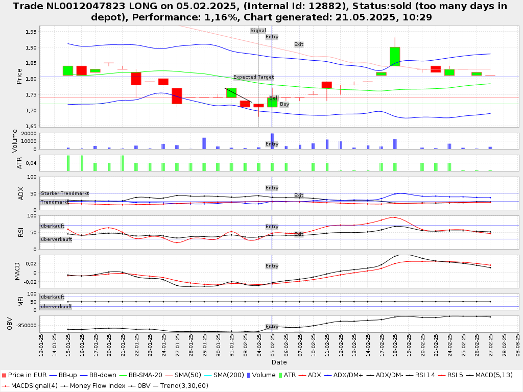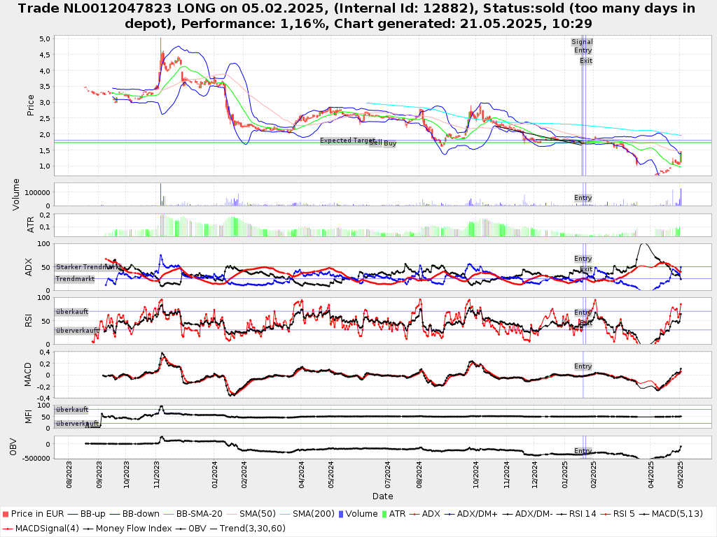 | Handelshistorie: | day 2: UPDATING STOP mark for LONG 47704 from 1.69 to 1.7, trade: trade id: 47704, stock.id: 12882 day 3: trade status update: in depot -> sold (too many days in depot), trade: trade id: 47704, stock.id: 12882 |
